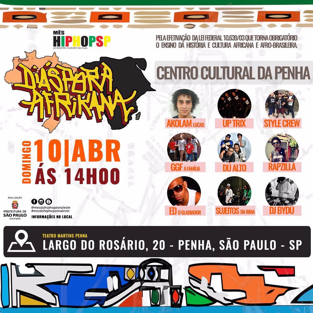 Aconteceu ontém dia 10/04/2016 no Centro Cultural Penha - São Paulo - Aconteceu mais uma amostra de HipHop o evento Sobre o Ensino da História e Cultura Afrikana e Afro Brasileira, apresentação de Bandas e a presença do grupo de HipHop - STYLE CREW perfomance do grupo STYLE CREW tocada por um DJ e Palestra falando sobre o Website Oficial STYLE CREW - HIPHOP ELEMENTO - A arte do elemento HipHop http://www.stylecrew.com.br